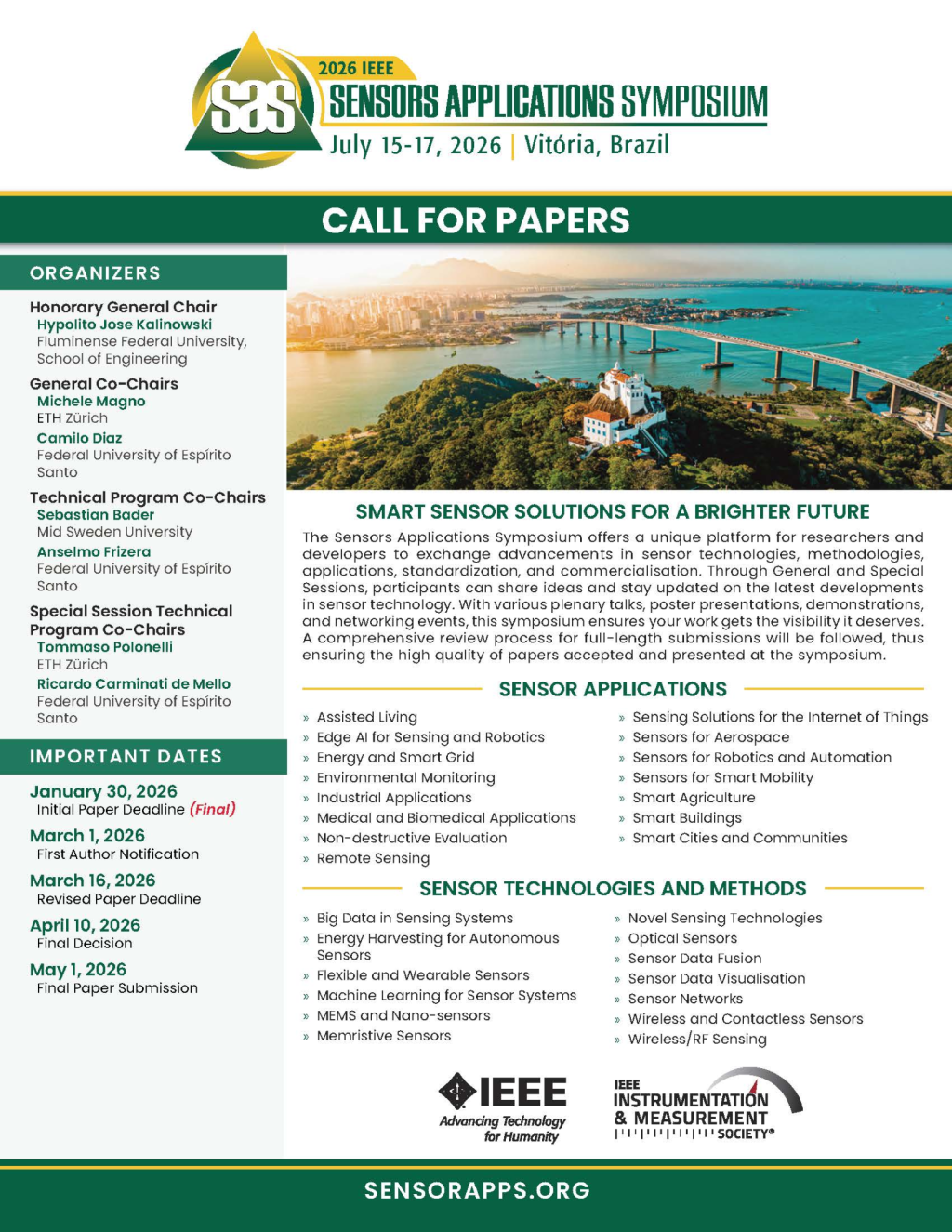 The Sensors Applications Symposium offers a unique platform for researchers and developers to exchange advancements in sensor technologies, methodologies, applications, standardization, and commercialisation. Through General and Special Sessions, participants can share ideas and stay updated on the latest developments in sensor technology. With various plenary talks, poster presentations, demonstrations, and networking events, this symposium ensures your work gets the visibility it deserves. A comprehensive review process for full-length submissions will be followed, thus ensuring the high quality of papers accepted and presented at the symposium.
